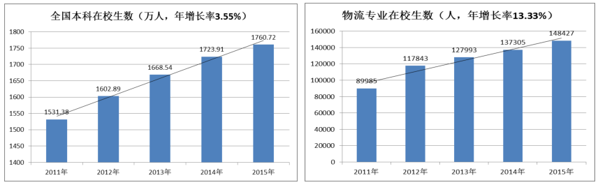 图11 全国本科生在校生数与物流专业在校生数、年增长率