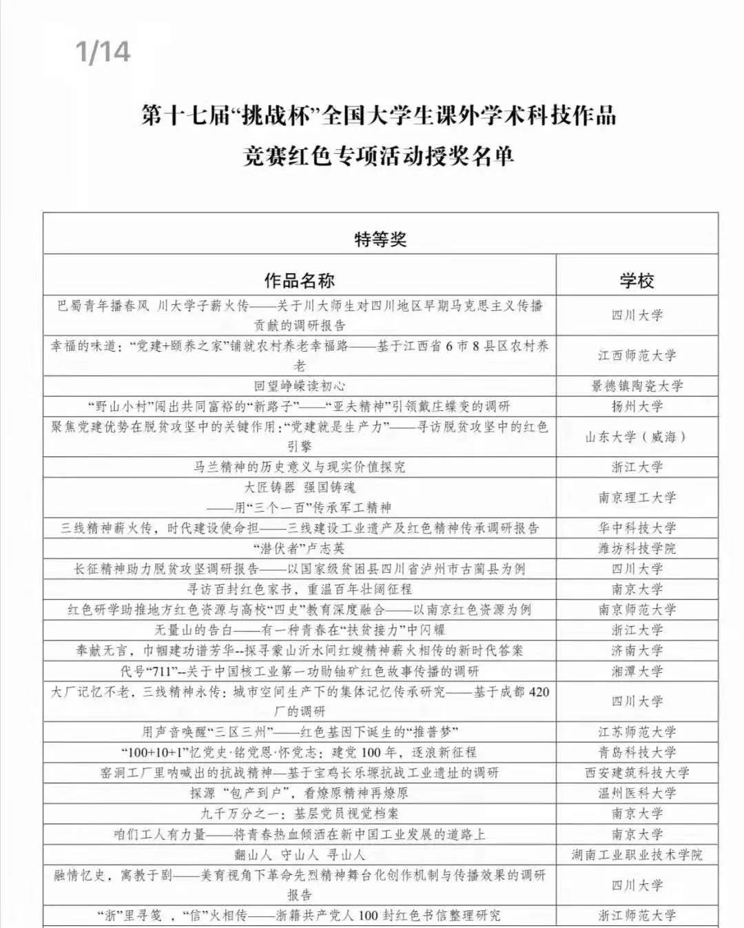 在刚刚落下帷幕的第十七届“挑战杯”全国大学生课外学术科技作品竞赛红色专项活动中,365英国上市“红”动青岛社会实践团队一路踏浪前行、披荆斩棘,由谭文老师指导的《寻忆青岛红色文化--基于红色旅游视角追溯建党百年历程》从全国数千件作品中脱颖而出,获得国家三等奖的优异成绩,成为今年英国365集团公司唯一入选国家级奖项的红色专项作品。