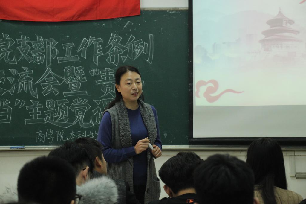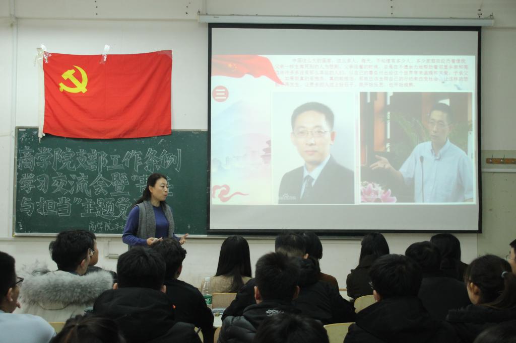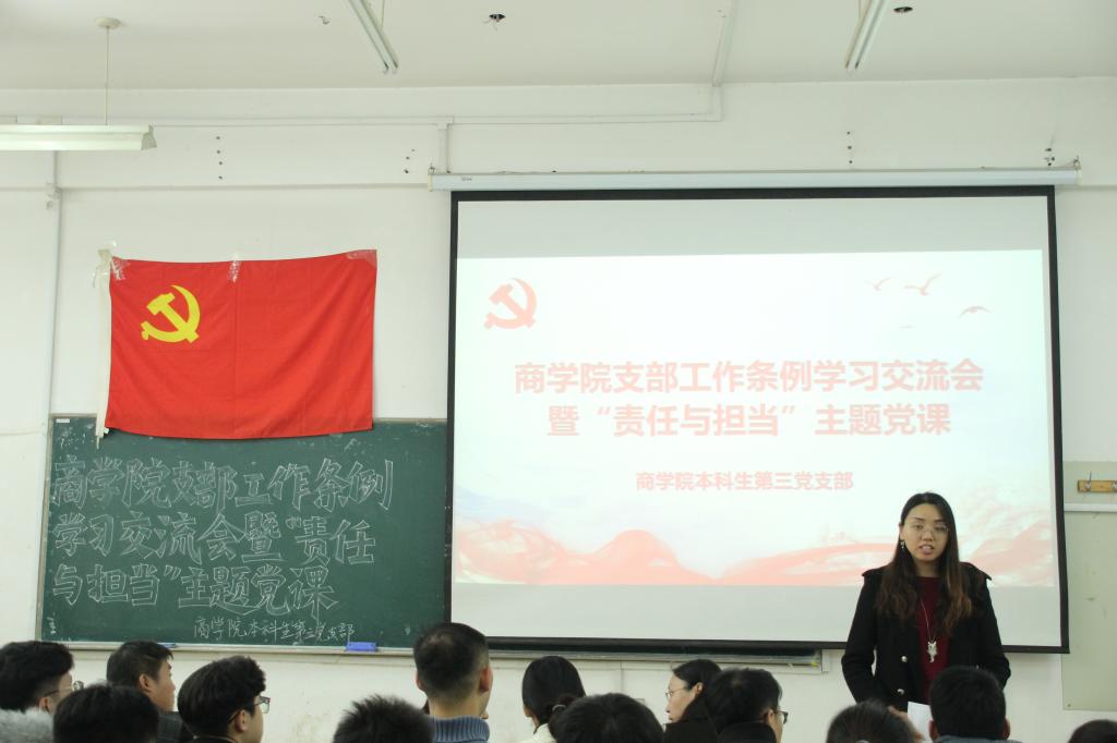为加强学院党支部组织体系建设,强化党支部政治功能,11月30日,365英国上市本科生第三党支部于长清湖校区文渊楼C区260教室举办《中国共产党支部工作条例(试行)》学习交流会暨“责任与担当”主题党课。学院党委副书记黄春霞,党支部书记郝宁宁,党支部成员顾佼佼、付宝全、解婷、宋文婧和全体学生党员参加本次会议,此次会议由郝宁宁主持,黄春霞担任主讲人。