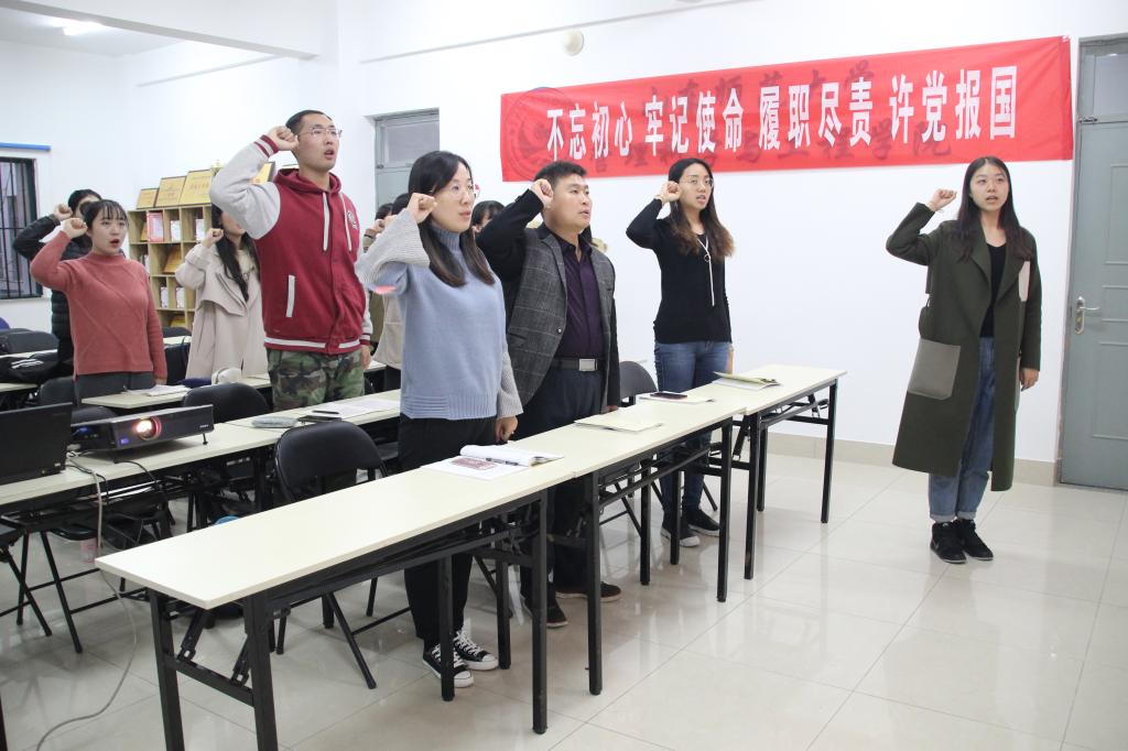 交流会伊始,郝宁宁带领全体党员观看黄群、宋月才、姜开斌、王继才同志相关事迹视频。青年党员在观看英雄先进事迹同时,纷纷记下心得与感悟。视频放映结束,郝宁宁谈到王继才同志守岛32年,用坚守与付出书写人生华章的先进事迹洗涤人的心灵,让在场党员为之动容。同时结合部分青年党员存在工作中应付,责任感不够强的问题,指出爱党并不是要求随时为党牺牲一切,而是踏踏实实做实事的深刻道理。并向青年党员提出要学会反思,锻炼加强党性,思想落实到行动中,发挥好先锋带头作用的要求,用实际行动带动其他人。在随后的党支部学生党员汇报感悟中,高博文积极发言,他提到英雄们保护试验台壮烈牺牲,王继才同志坚定理想信念,在艰苦的岗位上不忘初心诠释共产党的品格,践行共产党的初心与誓言。以先进典型为标杆,向优秀的党员看齐,将自己的所思所想落实到行动中,坚持不懈,持之以恒。其他青年党员均深受鼓舞,结合实际畅谈感悟,表示今后将会以更高的标准要求自己。最后,宋文婧做领誓人,带领青年党员在鲜艳的党旗下庄重地进行入党宣誓,希望他们不忘初心,做一名合格的共产党员。每个党员都掷地有声,声声都是对党忠诚的真情流露,形成庄严肃穆的氛围。至此,本次学习交流会圆满结束。