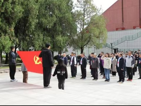 在孟良崮战役纪念馆,学员们向革命英烈敬献花篮,鞠躬默哀。全体党员面对孟良崮战役烈士英名塔,高举右拳,庄严宣誓,重温入党誓词。
