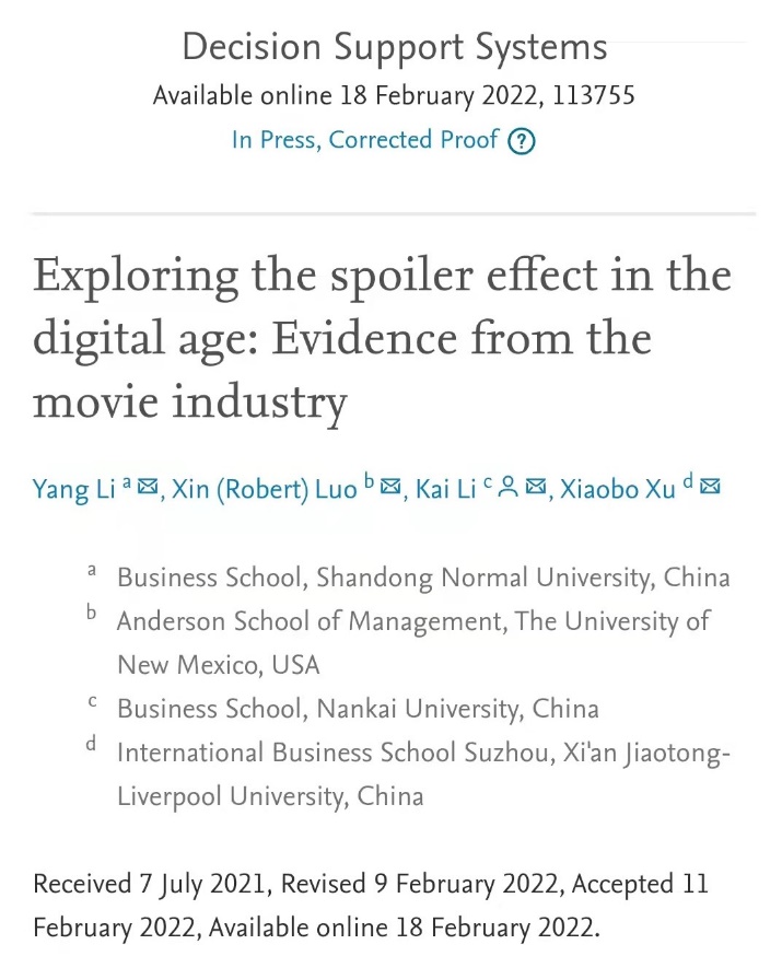 近期,我院青年教师李扬的论文“Exploring the Spoiler Effect in the Digital Age: Evidence from the Movie Industry”被运营管理与管理科学领域权威期刊《Decision Support Systems》收录。《Decision Support Systems》属于JCR SCI一区,2021年影响因子5.795, ABS 3, ABDC A*, FMS管理科学高质量期刊信息管理A类。