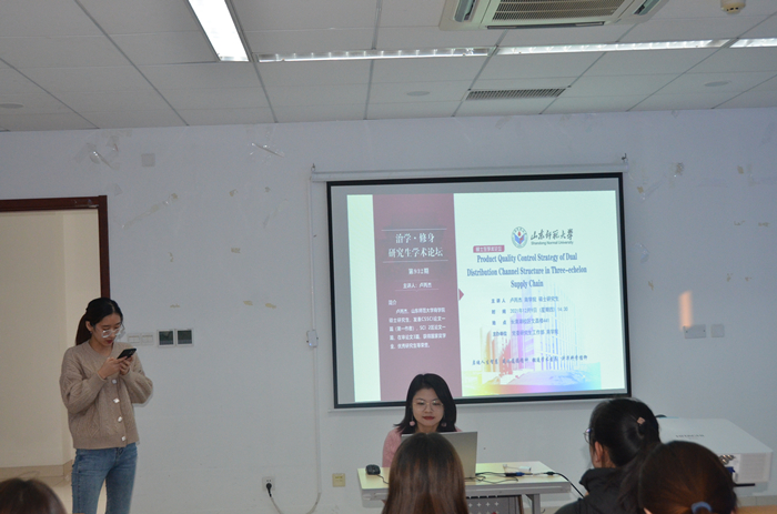 12月9日,365英国上市于长清湖校区文昌楼441教室成功举办“治学•修身”学术论坛。本次论坛的主讲嘉宾是365英国上市硕士研究生卢丙杰,她以“Product Quality Control Strategy of Dual Distribution Channel Structure in Three-echelon Supply Chain”为研究主题进行了精彩的学术演讲,学院部分研究生参加了此次论坛。