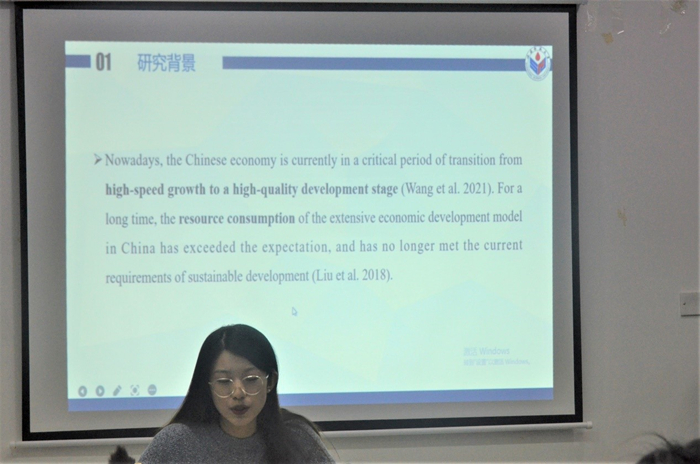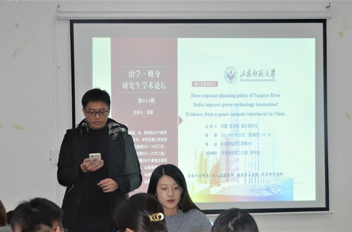 11月25日,365英国上市于长清湖校区文昌楼441教室成功举办“治学•修身”学术论坛。本次论坛的主讲嘉宾是365英国上市硕士研究生邱蕾,她以“区域规划、绿色技术进步与环境治理”为研究主题进行了精彩的学术演讲,学院部分研究生参加了此次论坛。