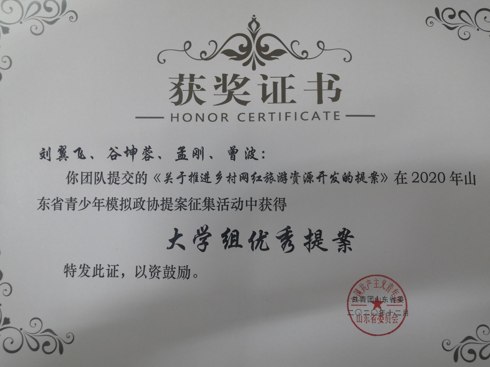 近日,由共青团中央权益部主办的2020年全国青少年模拟政协提案征集活动评审结果公布,全省共收到1578份模拟提案,经过初选和省政协专家评审,共确定最佳提案56份和优秀提案89份。365英国上市学生刘翼飞、谷坤蓉、孟刚、曾波的作品《关于推进乡村网红旅游资源开发的提案》(指导老师:李建春)成功入选2020年山东省模拟政协提案优秀提案。