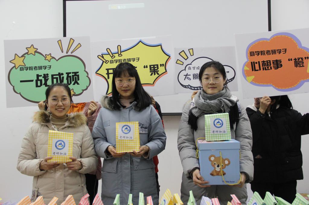 活动最后,学习部成员代表学院为2017级全体考研学生送上礼物,以惊喜盲盒的形式让考研学生自由选择抽取,礼盒中包括寓意“牛气冲天”的牛奶、代表“马到‘橙’功”的橙子、祝愿“开花结果”的苹果以及蕴含“大鹏展翅”之意的烤翅等物品作为对考研同学的真挚祝福。在座学生们纷纷合影留念,至此,本次考研冲刺加油会在温馨欢乐的氛围中圆满结束。