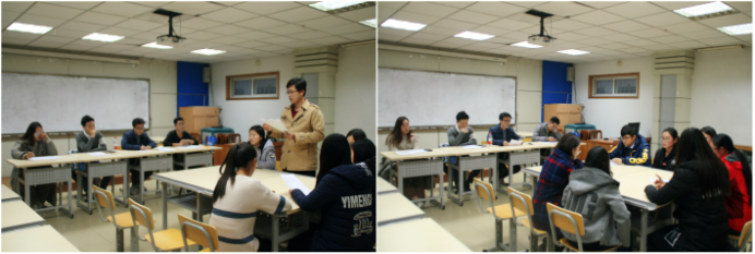 活动伊始, 所有选手分组进行无领导小组讨论,时间规划分为两分钟时间读题,三分钟个人观点陈述,十分钟小组自由讨论,两分钟总结。在主持人宣布开始后,选手们开始进行讨论。第一组选手的问题是火车是否应该改轨道问题,选手们从扳道工职责、人性、损失等方面出发,发表自己的观点,最后经过综合讨论,所有成员达成一致,得出火车应按照原轨道行驶的结论,并从五方面进行总结陈述。接着,高文钊点出题目所设置的道德陷阱以及答题时应该把握的方向,并对每位选手的表现进行点评,指出他们各自的特点和讨论时一些不足之处,同时,他也结合自身经验向选手们介绍面试时的得分点,选手们对此报以热烈的掌声。接着,其他小组分别讨论了“单位(外企)经费紧张,只有20万元,应如何使用”、“讨论china-health公司活动的时间、地点、人选、礼物类型”等问题,虽然过程中观点各异,但是经过充分讨论,均得出统一结论。最后,经过评委们的点评和打分,张光亮、吴浩杰等同学进入决赛。至此,模拟招聘会复试圆满结束。