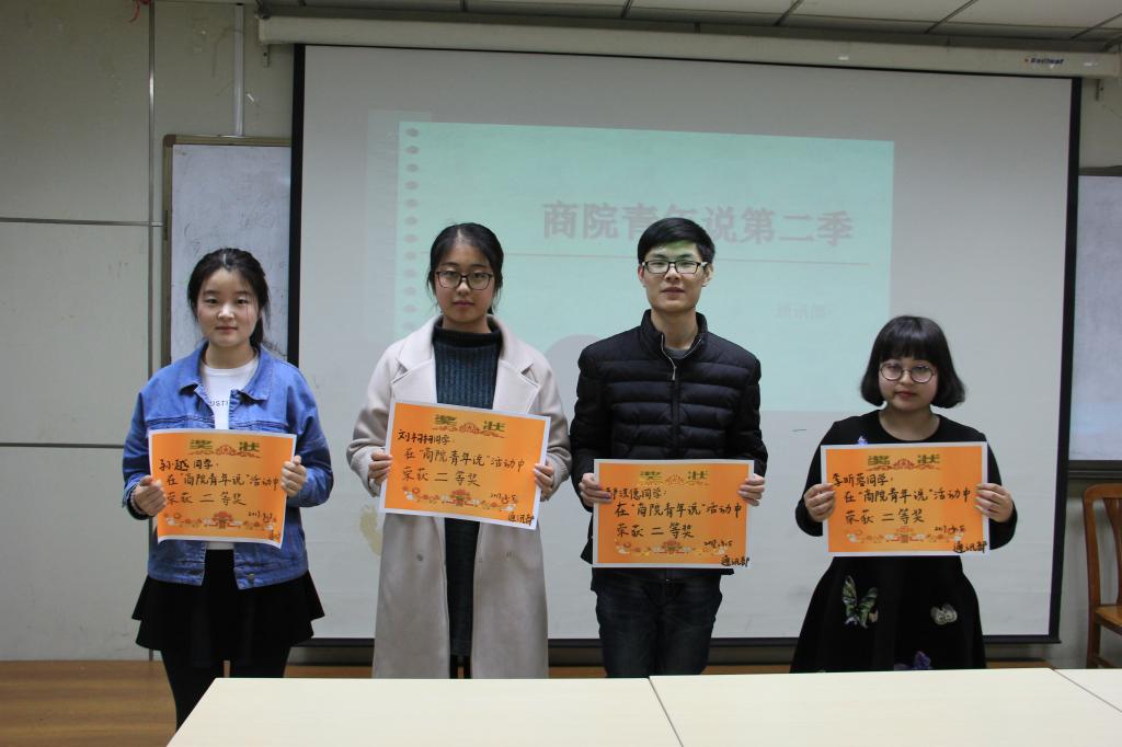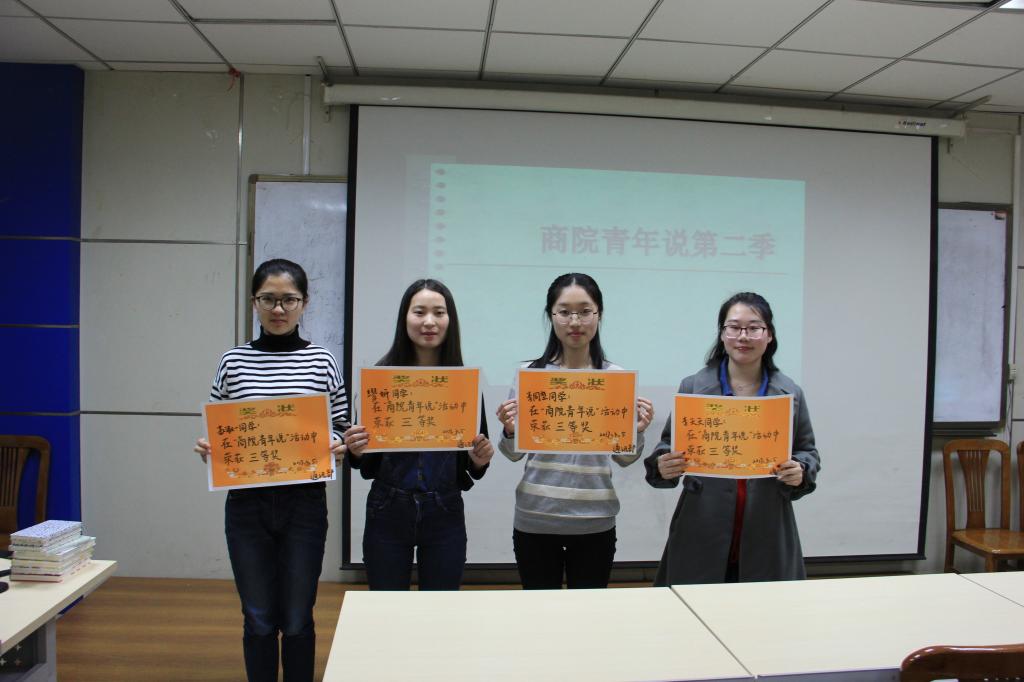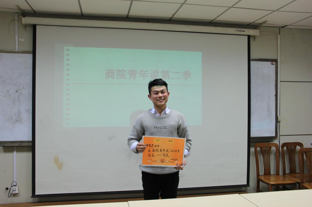 本次活动分为开场介绍、选手演讲、评选颁奖三个环节。在主持人进行了简短的活动介绍后,“商院青年说”活动正式开始。在最为主要也是最精彩的选手演讲环节,同学们各显神通,精彩纷呈的演讲十分吸引大家的眼球。物流管理1501班的孙越围绕同性爱情发表了自己的看法,认为它应该受到大家的尊重与理解,她语言时而犀利、时而幽默风趣,使得现场气氛活跃,得到了大家的一致好评。而财务管理1604班的李同堃向大家分享了自己带来的四道菜的制作过程,语言温柔平和,田园生活的感性也感染了在座的同学们。财务管理1603班的郝洪德探讨的女权主义引起了大家的深思,以男性的角度,发表自己对农村妇女地位低下的看法,深刻的理解与见地,辅以亲身经历的事例,使大家对于女权有了更加深入的认知。财务管理1603班的苏淑一则向大家介绍了自己喜爱的乐队五月天,“青春、梦想、坚持与努力”这些与我们息息相关的字眼都在她的演讲中谱成了一首歌,不仅让大家体会到了音乐不灭的魅力,也勾起了在座同学们关于青葱岁月的回忆。最后一位分享者物流管理1501班的张秀杰,则结合自身的经历,向大家介绍了自己的大学生活,以一个参照的方式给予同学们对大学生活的反思与未来学习生活的规划,具有很大的借鉴意义。在最后的颁奖环节,张秀杰同学获得了一等奖,郝洪德、孙越等四名同学获得了二等奖,缪妍、李同堃等四名同学获得了三等奖。在主持人对活动开展过程和参赛作品进行了简单总结和点评以后,此次活动在热烈的掌声中圆满结束。