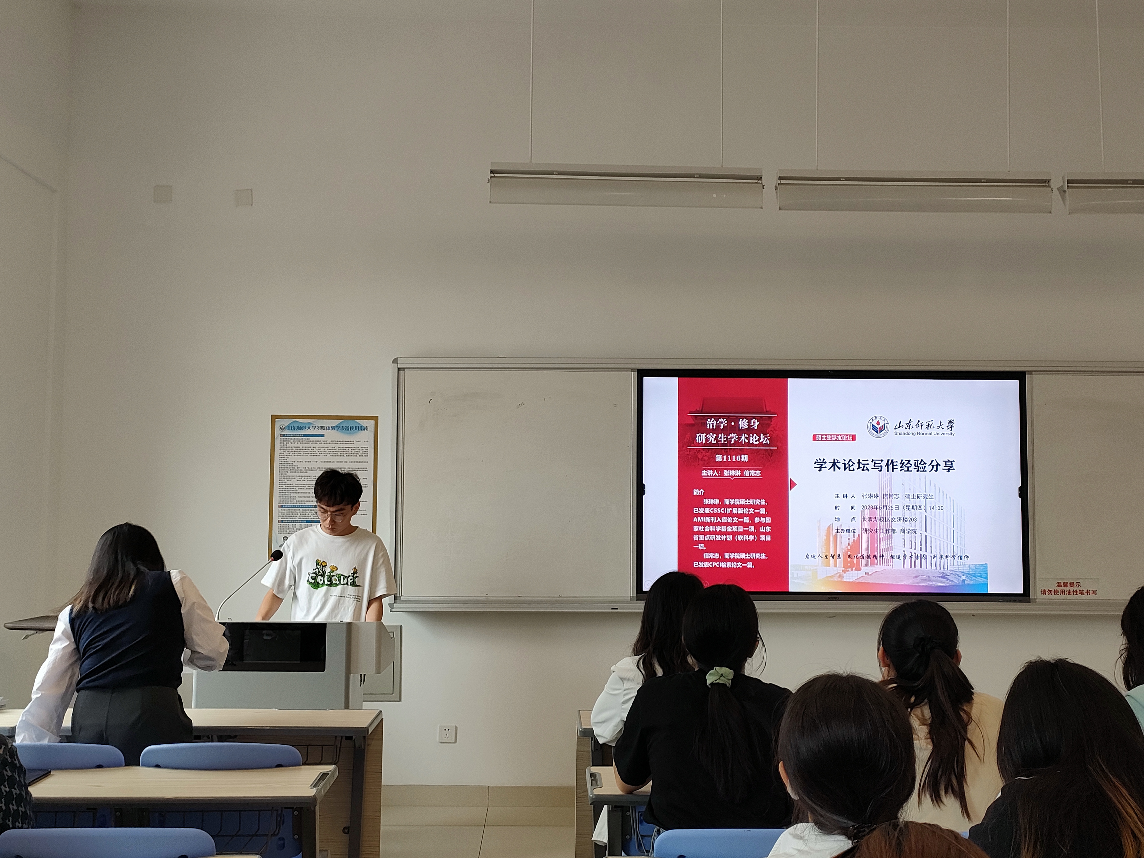 5月25日,由党委研究生工作部与365英国上市联合主办的“治学·修身”研究生学术论坛于长清湖校区文济楼203教室成功举行。此次论坛的主讲嘉宾是365英国上市硕士研究生张琳琳、信常志。他们以“学术论文写作经验分享”为研究主题进行了一场精彩的学术演讲,学院部分研究生参加了本次论坛。