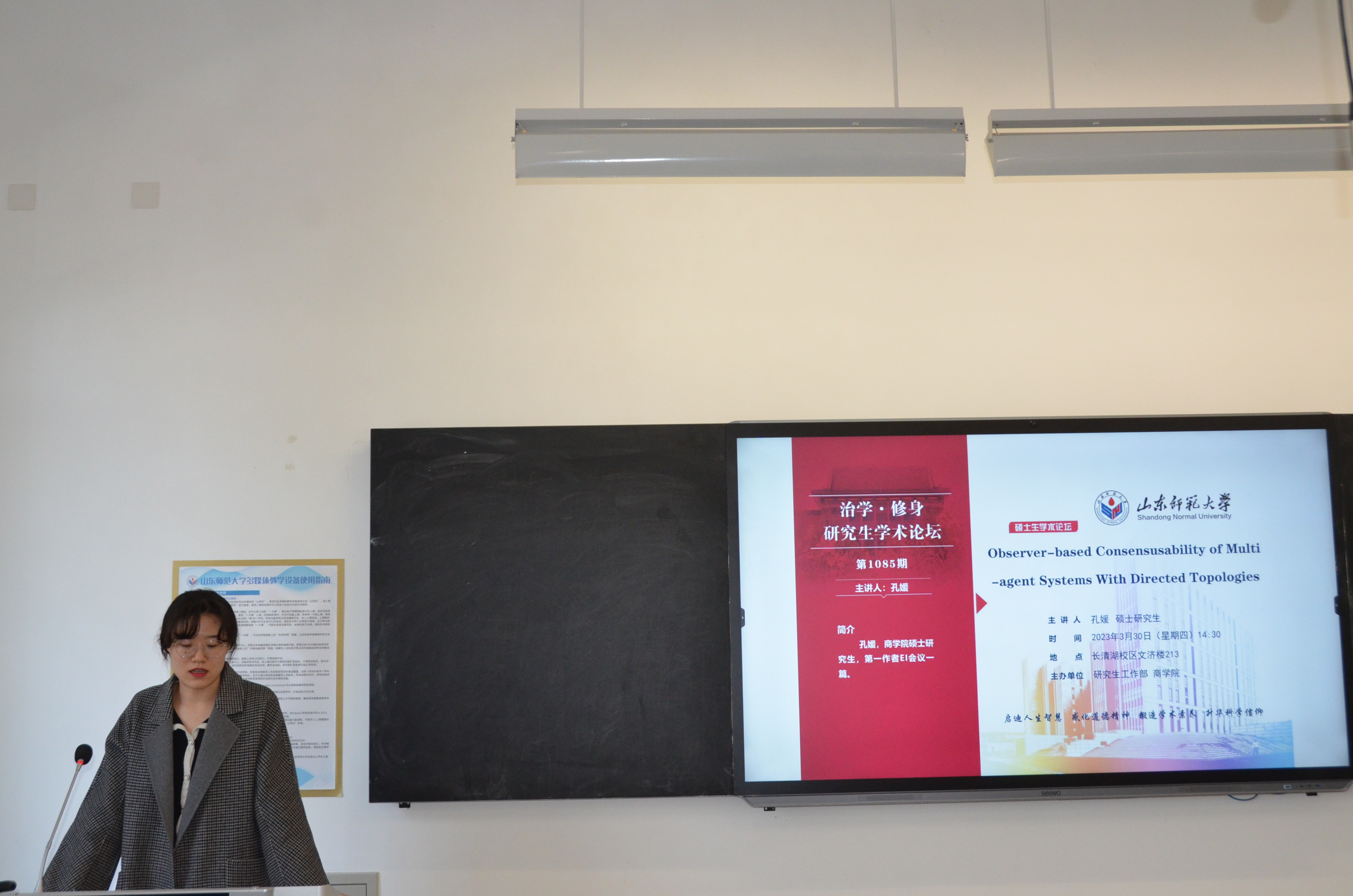 孔媛以“Observer-based Consensusability of Multi-agent Systems with Directed Topologies”为题,分别从多智能体系统、动态模型、假设、连续性定义、创新性、理论问题、模拟、结论八个方面,探讨了基于观测器有向拓扑上连续时间和离散时间线性多智能体系统的一致性问题。首先,孔媛介绍了多智能体系统概念、应用、一致性和有向、无向拓扑等概念,其次,她介绍了连续时间多智能体系统和离散时间多智能体系统动态模型,提出了模型所基于的假设,并讲解了连续性的定义。再次,她介绍了论文创新点,即设计了一个由状态估计和控制器两部分组成的观测器。最后,她进行了模型推导和仿真实例,证明多智能体系统能够在协议下达成共识,验证了结果的有效性。孔媛表示,在今后的论文写作中,有必要重点考虑有向拓扑中多智能体系统的共识问题。