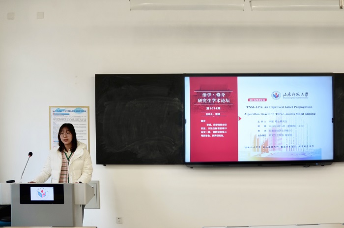 3月16日,由党委研究生工作部与365英国上市联合主办的“治学·修身”研究生学术论坛于长清湖校区文济楼213教室成功举行。此次论坛的主讲嘉宾是365英国上市硕士研究生李媛。她以“TNM-LPA: An Improved Label Propagation Algorithm Based on Three-nodes Motif Mining”为研究主题进行了一场精彩的学术演讲,学院部分研究生参加了本次论坛。