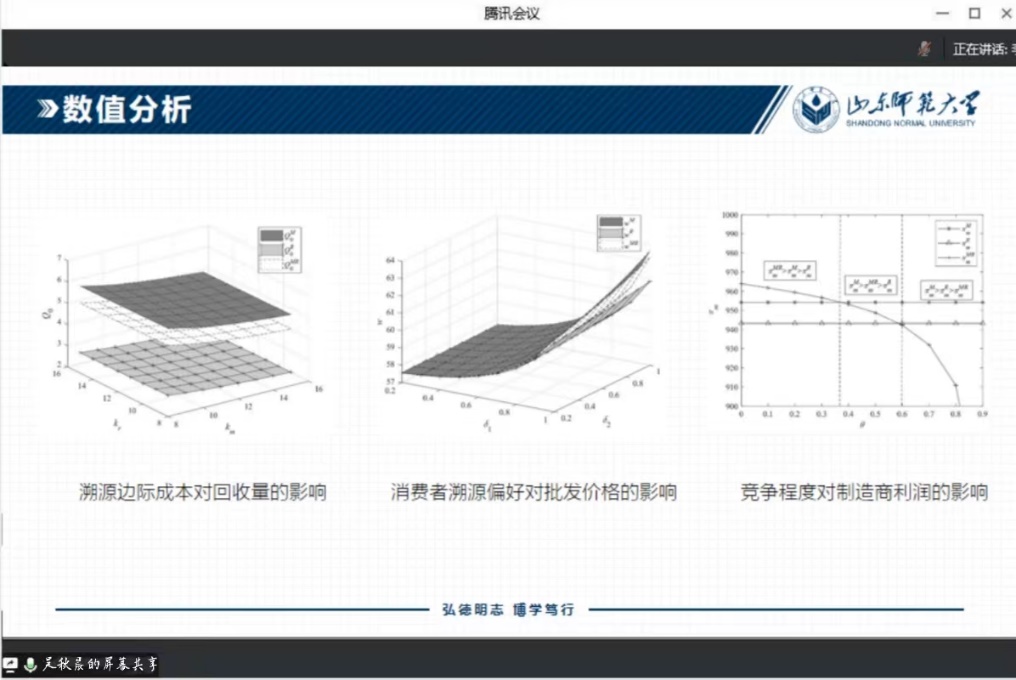 吴秋晨以“溯源供应链系统的回收模式选择”为题,分别从引言、问题描述、考虑溯源的供应链决策分析、回收模式选择分析、数值分析、研究结论六个方面展开阐述。她基于当下研究背景,提出了由于不同回收模式下的回收量受供应链各级成员溯源水平的影响,使得回收模式选择及供应链决策变得困难的问题。针对这个难题她详细论证了在制造商回收、零售商回收和制造商与零售商混合回收三种模式下的溯源水平、定价策略和回收量的最优决策。最后,她通过实证分析得出结论:当竞争程度较低时,制造商会选择混合回收模式;当消费者偏好高于一定阈值时,混合回收模式下回收量的提高更加明显。