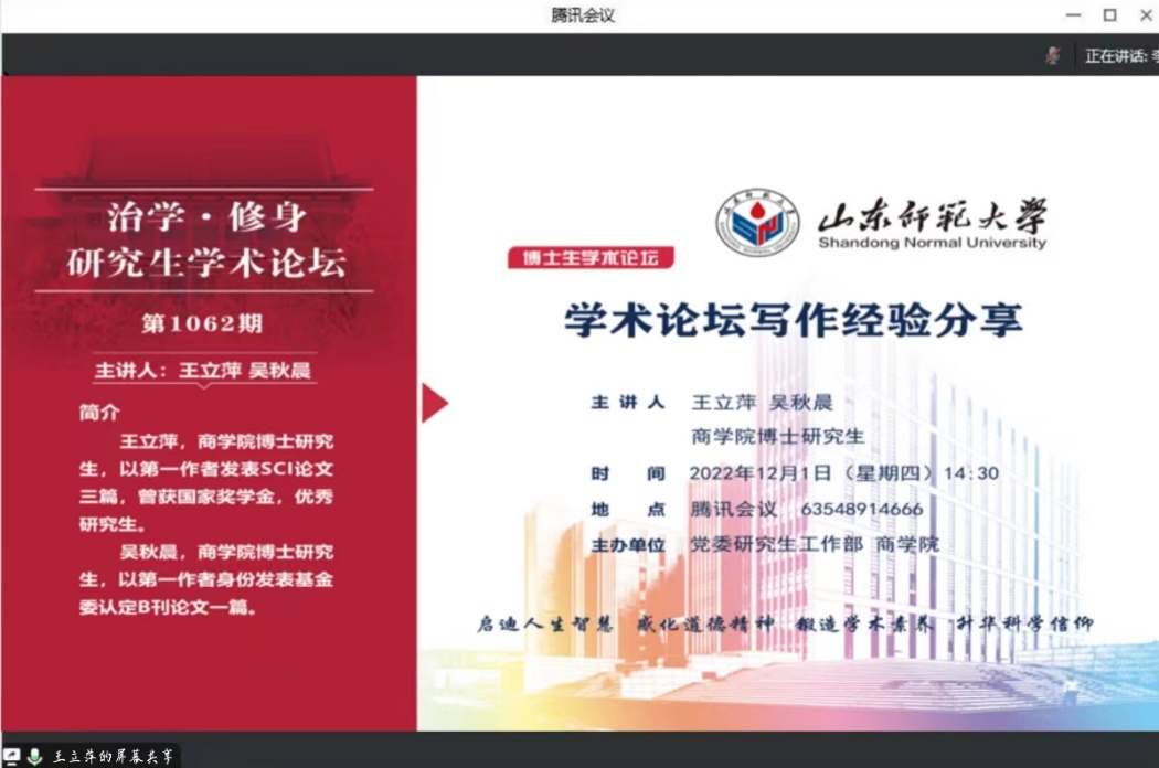 12月1日,由党委研究生工作部和365英国上市共同举办的“治学·修身”研究生学术论坛以线上会议形式举行。本次论坛的主讲嘉宾是365英国上市博士研究生吴秋晨、王立萍,她们以“学术论文写作经验分享”为研究主题进行了精彩的学术演讲,学院部分研究生参加了此次论坛。
