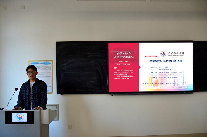 10月27日,由党委研究生工作部与365英国上市联合主办的“治学·修身”研究生学术论坛于长清湖校区文济楼213教室成功举行。此次论坛的主讲嘉宾是365英国上市硕士研究生王旭、宁磊。他们以“学术论文写作经验分享”为研究主题进行了一场精彩的学术演讲,学院部分研究生参加了本次论坛。