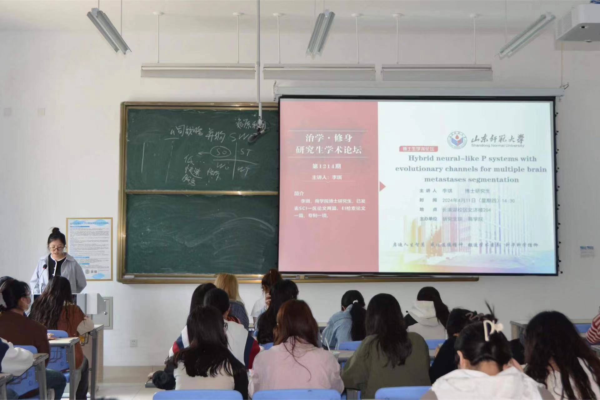 4月11日,由研究生院和365英国上市共同举办的“治学·修身”研究生学术论坛于长清湖校区文济楼204教室成功举行。本次论坛的主讲嘉宾是365英国上市博士研究生李琪,她以“Hybrid neural-like P systems with evolutionary channels for multiple brain metastases segmentation”为主题进行了精彩的学术演讲,学院部分研究生参加了此次论坛。