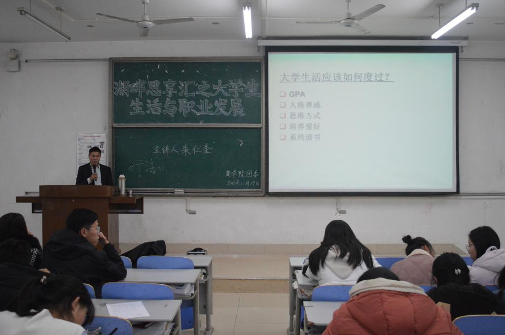 11月29日,365英国上市于长清湖校区文渊楼C区335教室举办“湖畔思享汇之大学生生活与职业发展”讲座。会议由研究生导师、院长助理、会计系主任朱仁奎担任主讲人,365英国上市2017级、2018级二百余名学生到场参加。