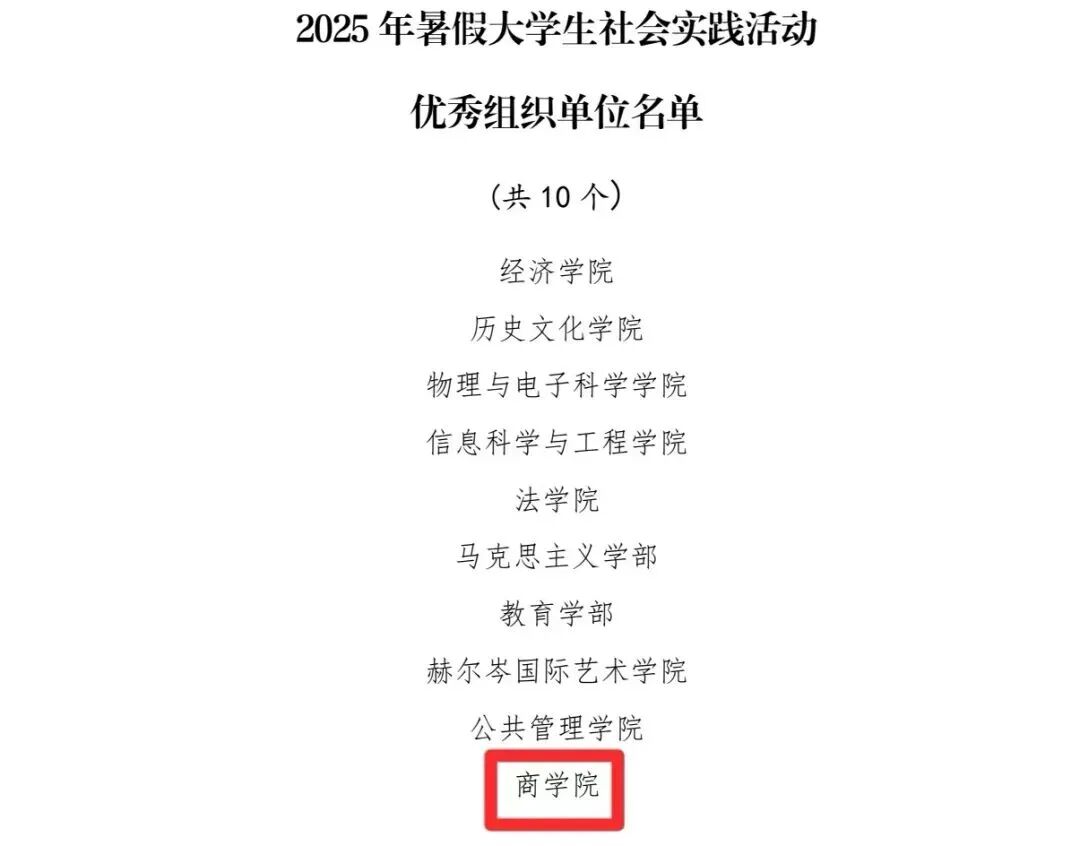 学院在此次表彰中硕果累累,充分彰显了商院学子们扎根社会、服务基层的责任与担当。从探索绿色经济到传承红色基因,从助力乡村振兴到投身基层服务,学子们以脚步践行使命,用实干书写青春华章。下一步,学院将持续完善实践育人机制,着力培养既有创新思维又具社会担当的新时代商科青年!