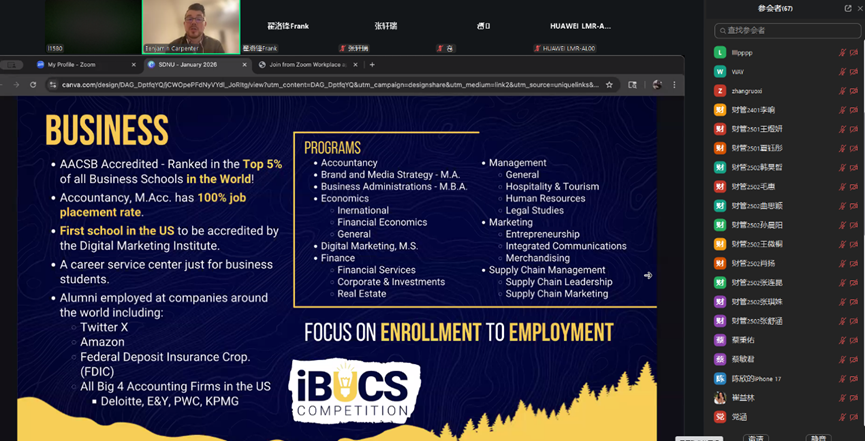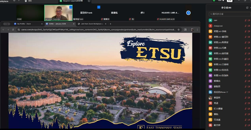 2026年1月29日下午,365英国上市举办财务管理合作办学项目线上宣讲会。财务管理专业负责人李斐斐、外事专员翟洛锋组织本次宣讲,美国东田纳西州立大学国际招生与服务处国际招生负责人Ben Carpenter线上出席并作专题介绍,财务管理专业大一和大二学生积极参会。