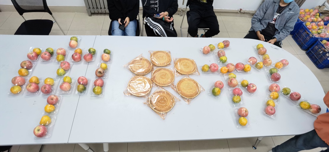 现场工作人员提前用盒装水果、月饼拼出了“中秋”字样,增添了浓厚的中秋节氛围。