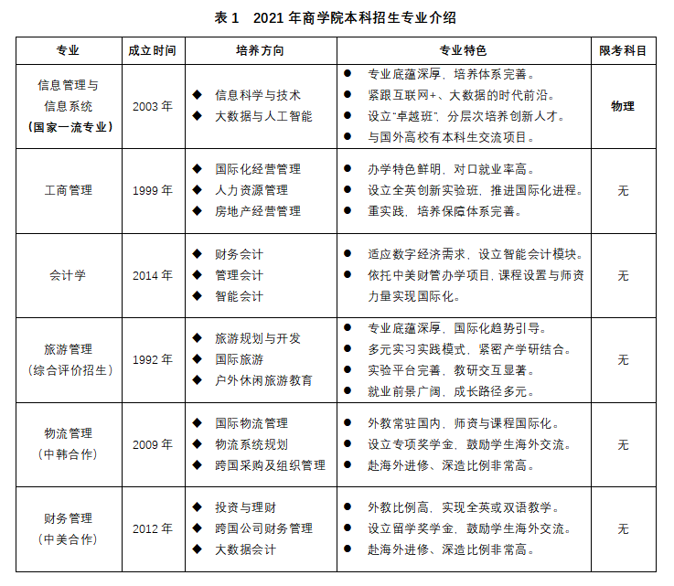 2021年,365英国上市招生专业有信息管理与信息系统、工商管理、会计学、旅游管理、物流管理、财务管理。其中,信息管理与信息系统为首批国家级一流本科专业,也是山东省“名校建设工程”支持专业、山东省特色专业;工商管理和会计学专业属于工商管理大类招生;旅游管理专业采取综合评价方式进行招生;物流管理和财务管理属于中外合作办学项目,合作方分别为韩国又石大学和美国东田纳西州立大学。