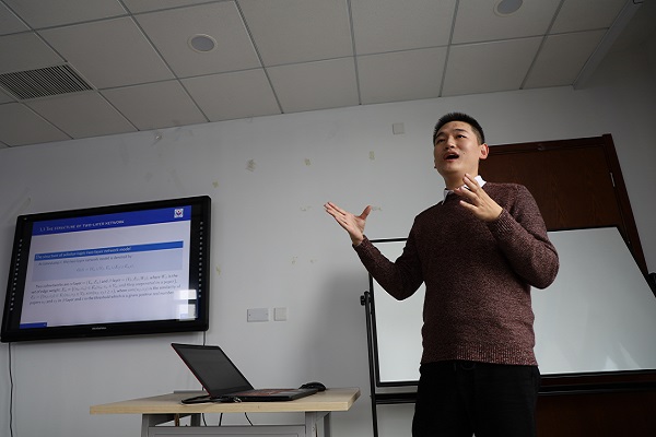 会议伊始,宋乐用轻松易懂的方式向大家介绍了如今学者合作研究的问题,并由此引出了研究产生的原因,使同学们对本次的学术论坛有了初步的认识。接下来宋乐讲述了如何通过双层网络结构模型来定义和识别学者及其论文话题的状态类别,从理论上证明了双层状态耦合分析模型的收敛性,给出了该模型对于合作网络中知识涌现阈值评估的解析解。最后利用Aminer检索系统对数据集进行实证分析和应用。