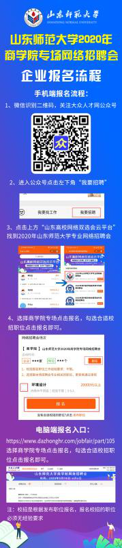 电脑报名入口:“大众人才网山东高校网络双选会云平台”https://www.dazhonghr.com/jobfair/part/105的“企业报名”和“个人报名”入口进行报名。
