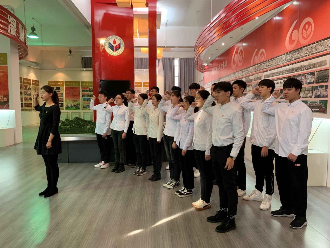 此次活动旨在通过参观学习、感悟交流的方式,切实引导学生了解校情校史、传承学校精神文化,增进爱校荣校情怀。本次活动由参观校史馆和学习交流会两大部分组成。活动伊始,在宋文婧领誓下,全体学生党员面对党旗庄严宣誓,共同重温了入党誓词。讲解时,宋文婧借助珍藏的文史资料,从早期岁月、办学历史与蓬勃发展三个方面带领大家回顾学校的发展历程。在讲到文化传承时,她表示,自建校以来一批批师大人潜心学术、精诚奉献,将教书育人的初心与使命代代星火相传,为学校积淀了丰厚的文化底蕴,形成了弘德明志、博学笃行的校训和爱国爱校、为人师表、勤奋严谨、求实创新的校风。学生党员纷纷表示,本次参观深刻感地受到学校厚重的历史沉淀、沧桑的办学历程、丰硕的办学成果和艰苦创业的精神,并为学校的蓬勃发展感到自豪骄傲,在今后的学习和工作中会牢记党员的初心使命,发挥党员先锋模范作用,为学校的建设贡献自己的力量。