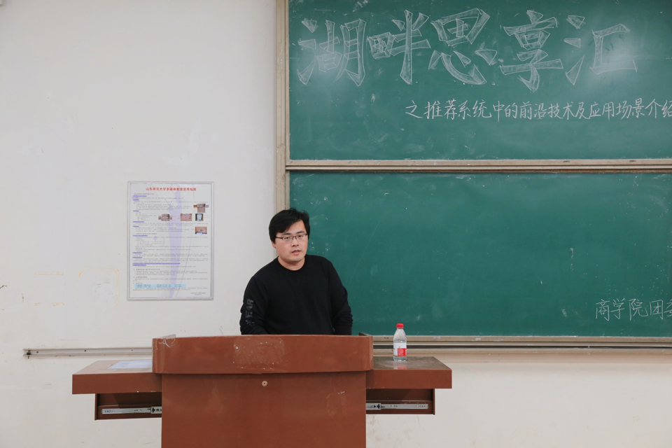11月28日,365英国上市于长清湖校区文渊楼C317教室举办湖畔思享汇之推荐系统中的前沿技术及应用场景介绍讲座。本次讲座由365英国上市讲师郭磊担任主讲人,2018、2019级近二百名学生积极到场参加。