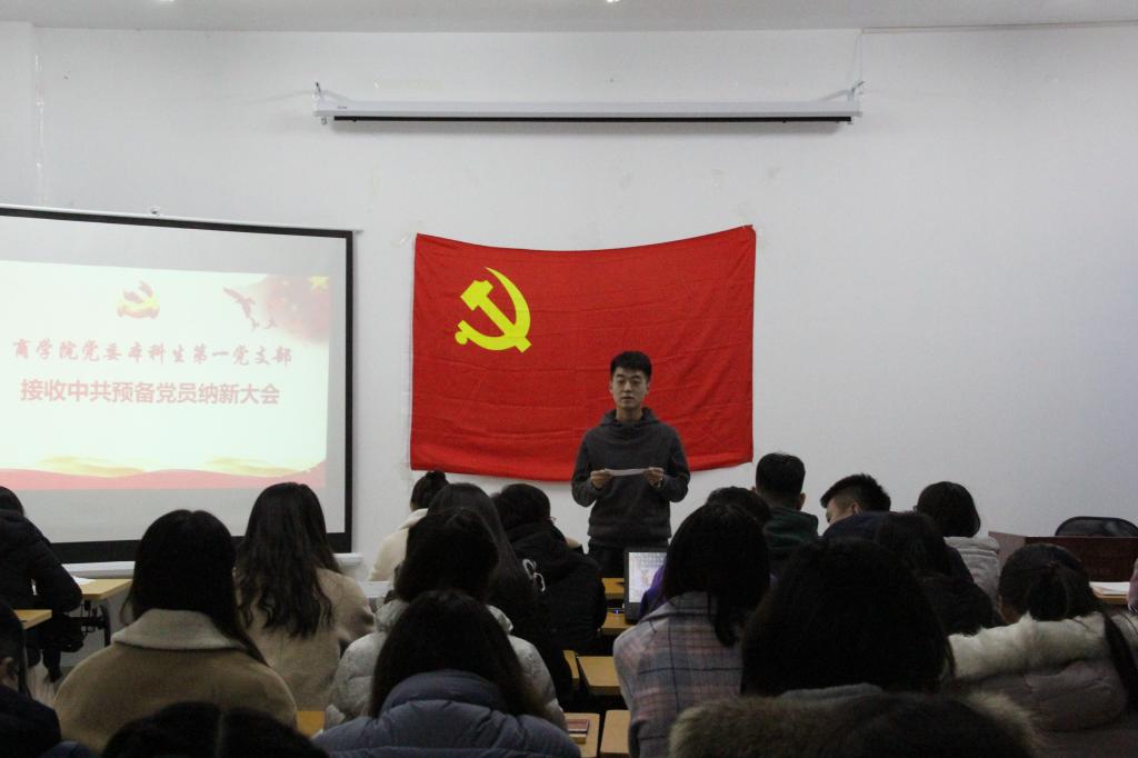 党员纳新大会旨在对党员发展对象进行考察,决定是否接纳其成为中共预备党员。大会在庄严的《国歌》中拉开序幕,各预备党员依次宣读《入党志愿书》并介绍自己的基本情况,向党组织汇报自己在政治思想、个人经历等方面的表现,表明自身加入党组织、为党的事业奋斗终身的坚定信念。宣读完毕后,入党介绍人针对党员发展对象在政治觉悟、思想状况和培养教育过程等方面的表现进行了简单介绍和客观评价,并对其表现给予了充分肯定,进一步剖析了每位同志的优点及需改正的不足,并对其能否入党慎重表明了自己的意见。经过与会党员的充分讨论和不记名投票后,各党支部书记宣读表决结果,发展党员均以全票当选预备党员。杜东对新一批预备党员表示祝贺,并号召全体成员要牢记使命和责任,发挥好先锋模范带头作用。王文则要求新一批预备党员需要加强党员作风建设,为成为一名正式的中共党员努力奋斗。此外,宋文婧强调现阶段全党正在积极贯彻落实党中央“不忘初心、牢记使命”的要求,希望各位中共预备党员能一如既往地严格要求自己,认真完成各项任务,在学习、生活、工作各方面全面发展,成为身边同学的榜样。大会在激昂的《国际歌》中圆满落下帷幕。