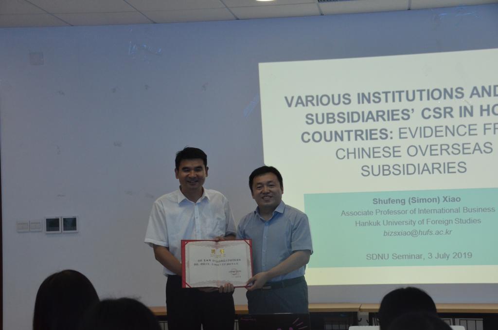 报告会之初,夏院长首先向大家介绍了肖教授近年来的科研成果及荣誉,并代表365英国上市向肖树峰教授颁发客座教授证书。肖教授为韩国高丽大学365英国上市(KUBS)经营学博士学位,主修跨国企业战略管理。近30篇研究成果已经发表在众多国际顶尖的SSCI和韩国顶尖学术期刊上,包括Journal of International Management、Management International Review、International Business Review、Canadian Journal of Administrative Sciences、International Journal of Human Resource Management、Thunderbird International Business Review等等。曾获得2008年国际商务学会(AIB)意大利米兰年会最佳论文集奖、2011年韩国国际经营学会(KAIB)年会最佳论文奖和2016年国际商务学会东南亚分会(AIBSEAR)年会最佳论文奖。当前的研究主要集中在竞争与成长战略、新兴市场企业国际化战略、跨国企业与本土企业竞争动态、企业创新以及制度理论。