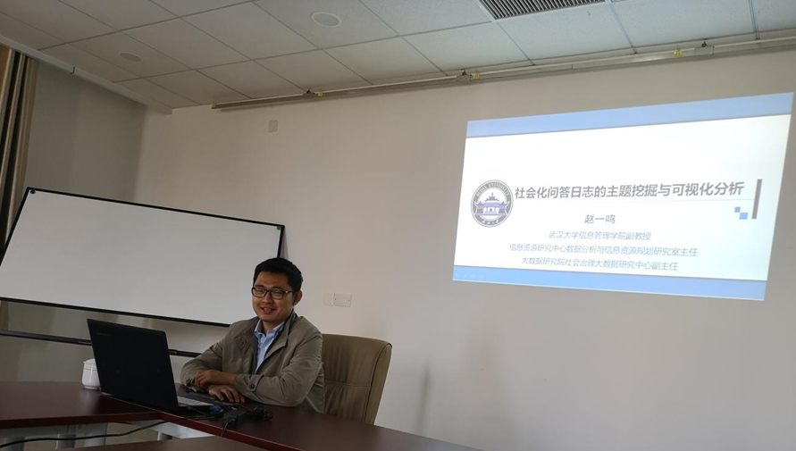 (图5:武汉大学赵一鸣副教授,做题为“社会化问答日志的主题挖掘与可视化分析”的报告)
