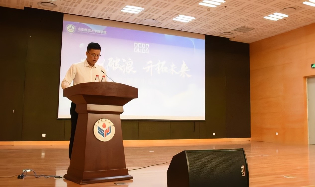 青年教师代表王达发言,他告诉同学们如何应对大学生活的挑战和考验,适应大学的生活节奏,真正从思想上完成从高中到大学的转变。他指出,进入理想的大学只是大家人生愿望清单上的其中一项,而不是拼搏的终点,希望同学们保持初心不改、继续怀揣理想、不负青春韶华、在学习中下足真功夫,在实践中练就真本领。