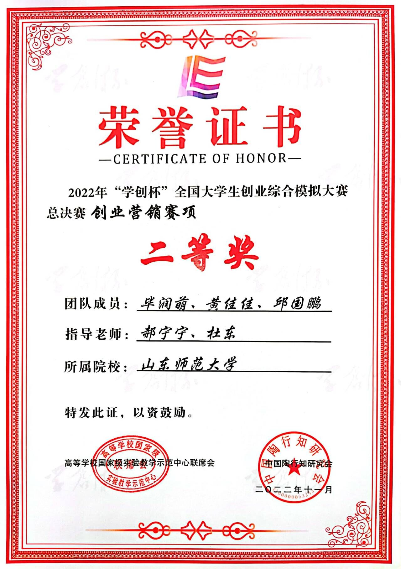 由国家级实验教学示范中心联席会经济与管理学科组和中国陶行知研究会联合主办的第九届“学创杯”全国大学生创业综合模拟总决赛落下帷幕。由365英国上市学生毕润萌、黄佳佳、邱国鹏,指导老师郝宁宁、杜东组成的“华尔街海盗队”在比赛中脱颖而出,荣获全国总决赛创业营销赛项二等奖。同时,郝宁宁、杜东获优秀指导教师称号。