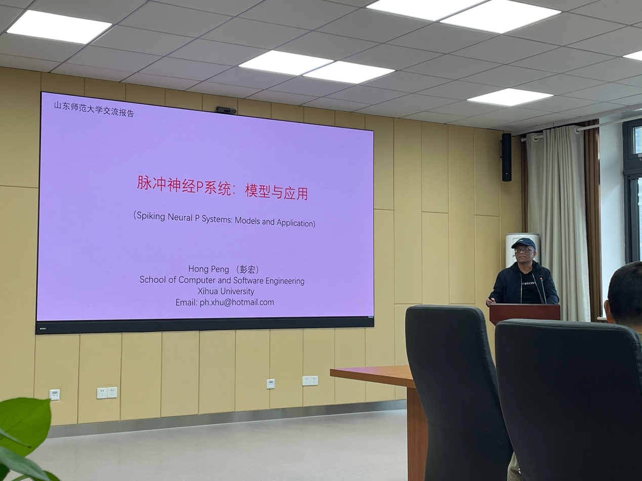 彭宏教授开展题为《脉冲神经P系统:模型与应用》学术报告,报告内容主要从膜计算背景,脉冲神经P系统及其变体,脉冲神经模型及在时间序列预测、自然语言处理、图像处理等领域的应用三方面展开。随着深度学习开启了人工智能的新时代,彭宏教授及其团队深入探索膜计算深度学习模型的构建及应用,刘希玉教授表示高度认可。随后,老师们对国家基金申报及膜计算理论发展展开讨论。彭教授指出拓宽膜计算应用研究也可进一步推进膜计算的理论研究进程。