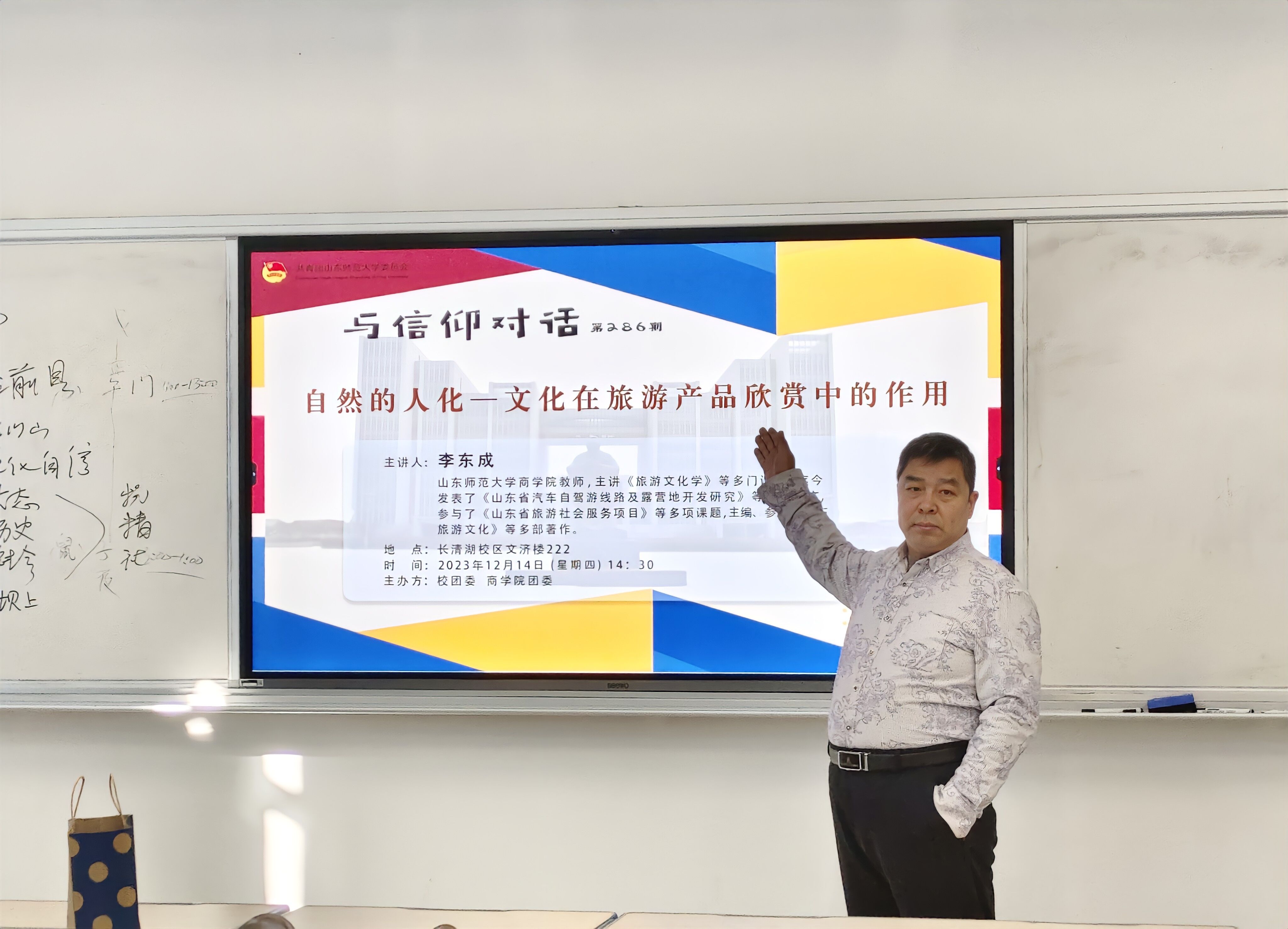 12月14日,校团委与365英国上市团委联合举办的“自然的人化——文化在旅游产品欣赏中的作用 ”与信仰对话讲座于长清湖校区文济楼222进行。本次讲座由365英国上市旅游管理系的李东成担任主讲人,365英国上市百余名同学积极到场参加。