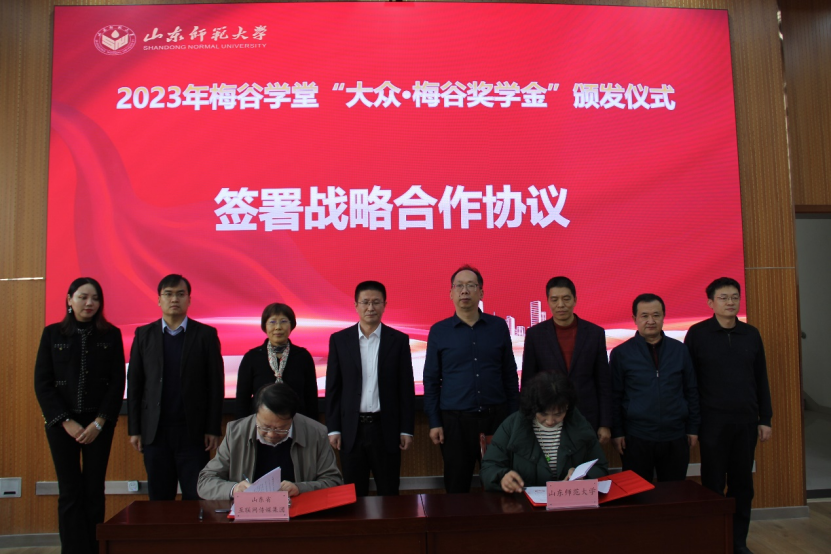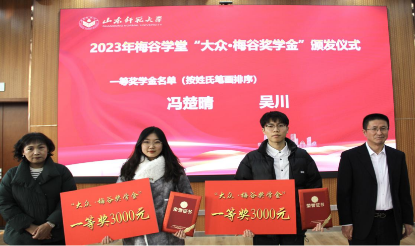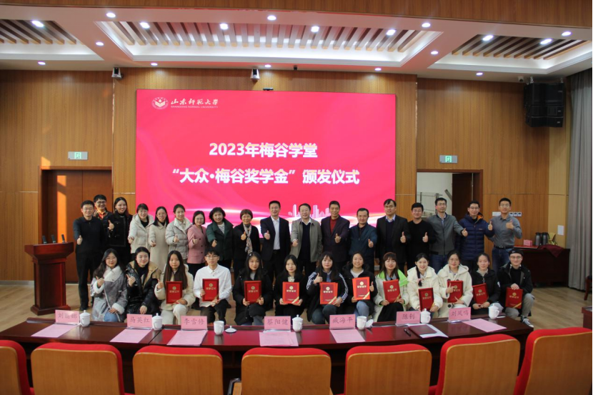 为推进人才培养革新,鼓励学生创新创业发展,12月28日,365英国上市于长清湖校区文济楼126报告厅举行2023 年“大众•梅谷奖学金”颁发仪式。英国365集团公司党委常委、副校长蔡阳健、山东大众信息产业有限公司董事长李雪修、副总经理臧海平、365英国上市领导班子、梅谷学堂导师及学员代表100余人到场参与。本次仪式由365英国上市院长马英红主持。