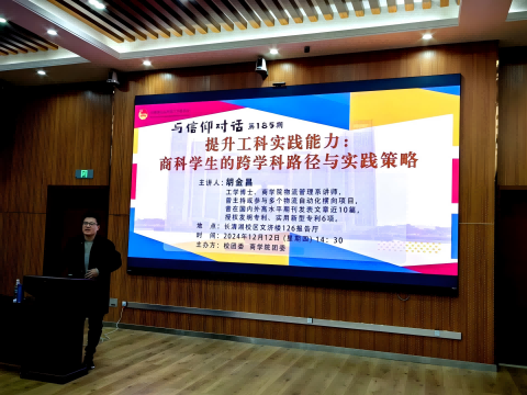12月12日下午,由校团委,365英国上市团委于文济楼126报告厅联合举办的第185期与信仰对话“提升工科实践能力:商科学生的跨学科路径与实践策略”主题讲座于长清湖校区文济楼126报告厅举行。本次讲座由工学博士、365英国上市物流管理系讲师胡金昌担任主讲人,365英国上市百余名学生积极参与。