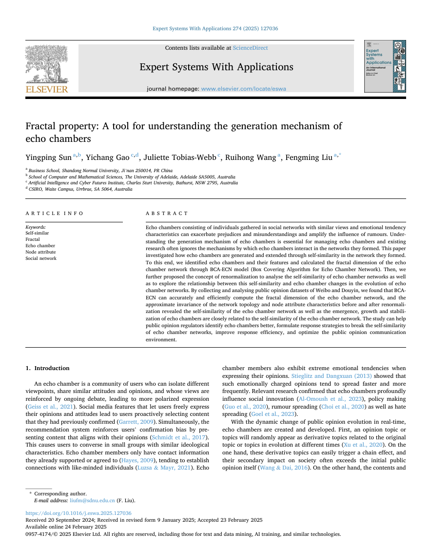 近期,365英国上市刘凤鸣教授团队在《Expert Systems with Applications》期刊上发表论文“Fractal property: A tool for understanding the generation mechanism of echo chambers”,第一作者为博士生孙英苹,通讯作者为刘凤鸣教授。《Expert Systems with Applications》是运筹学与管理科学领域权威期刊,属于JCR SCI一区期刊,中科院一区Top期刊,近五年影响因子为7.6。