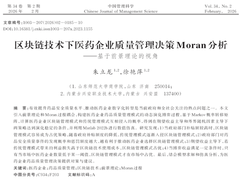 近日,365英国上市朱立龙教授与博士研究生徐艳萍合作的论文《区块链技术下医药企业质量管理决策Moran分析——基于前景理论的视角》,发表在管理学权威期刊《中国管理科学》,朱立龙教授为本文第一作者、通讯作者。《中国管理科学》由中国科学院主管,2025年复合影响因子9.582,是教育部学科评估A类期刊、国家自然科学基金委管理学部指定A类期刊、国家卓越期刊计划T1级期刊、CSSCI来源核心期刊、全国中文核心期刊,连续13年荣获“最具国际影响力学术期刊奖”。
