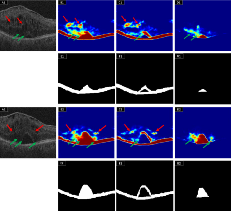 图 A1、A2:原始OCT图像;B1、B2:EZ-BM区域的注意图;C1、C2:无CSC区域的EZ-BM的注意图;D1、D2:CSC病变的注意图;红色箭头表示异常外丛状层导致的分类错误;绿色箭头表示OCT图像中不同区域对比度低导致的分类错误。E、F和G是B、C和D的标签。