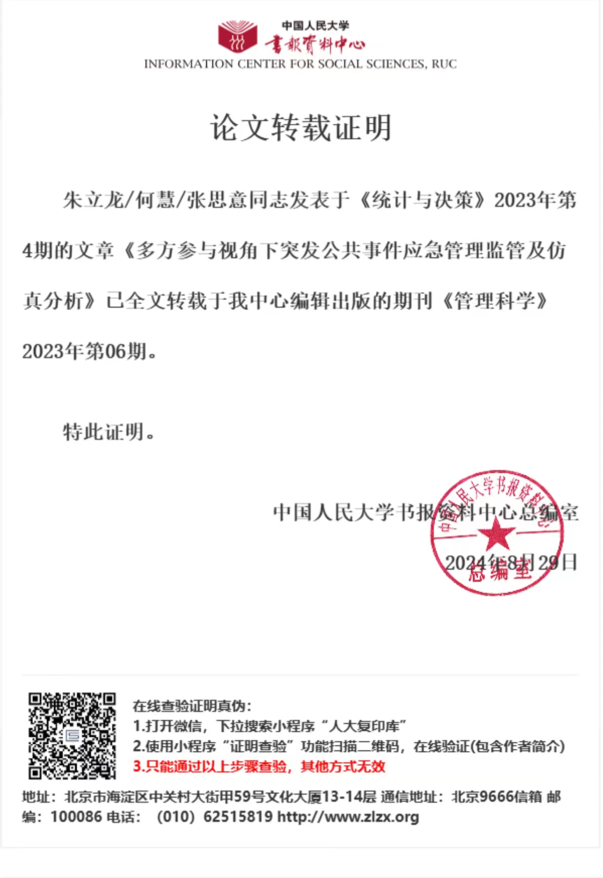 近日,我院朱立龙教授团队的论文《多方参与视角下突发公共事件应急管理监管及仿真分析》,被《中国人民大学复印资料》全文转载于《管理科学》2023年第6期,这是朱立龙教授团队第2篇被《中国人民大学复印资料》全文转载的论文。