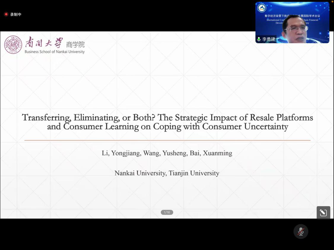 李勇建教授做题为“Transferring, Eliminating, or Both? The Strategic Impact of Resale Platforms and Consumer Learning on Coping with Consumer Uncertainty”的特邀报告。他以微观视角为着力点,详细阐释了转售平台与消费者学习对卖家结果的不同影响和相互作用机制,并对如何切实利用转售平台带来的市场机会提出了两点建议:一是消费者学习比转售平台更能给卖家带来价值。二是在生产成本较低的情况下,不准确的消费者学习可以将需求影响转化为积极影响。