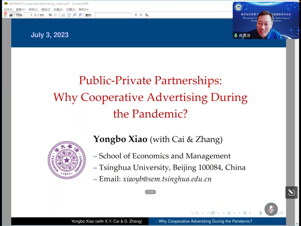 肖勇波教授的发言主题是“Public-Private Partnerships: Why Cooperative Advertising During the Pandemic?”。他以农业大省--云南为例,深度挖掘了政府对产品促销交互式干预方式的影响。他表示,本次研究的意旨为进一步发挥企业营销的长期暴露效应。在后续研究中,将持续扩展研究领域,对初始库存水平可以内生确定的情况、多个竞争企业多产品间的耦合影响等方面展开进一步探究。