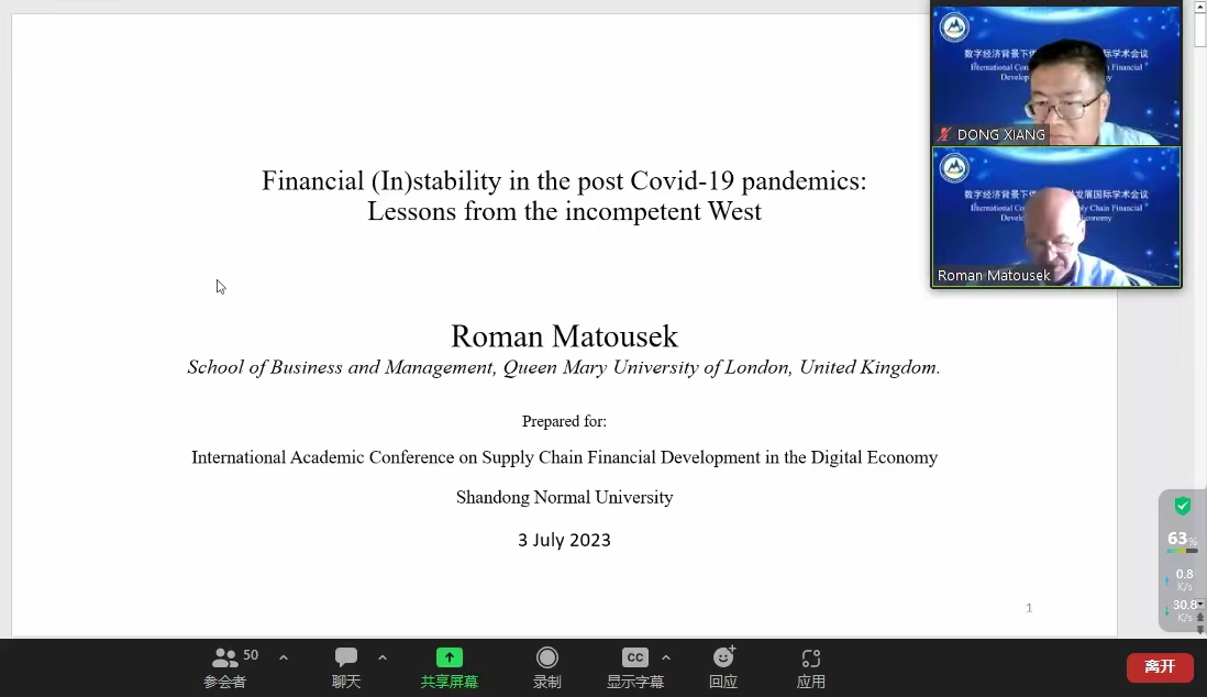 Roman Matousek教授发表了题为“Financial (In)stability in the post Covid-19 pandemics: Lessons from the incompetent West”的主题发言。他提到,后新冠肺炎时期的经济复苏堪称近年来国际界最为关注的热点。在未来,因为不可持续的企业和家庭债务,资产价值会迅速下降,预计欧盟各国都将出现明斯基时刻。