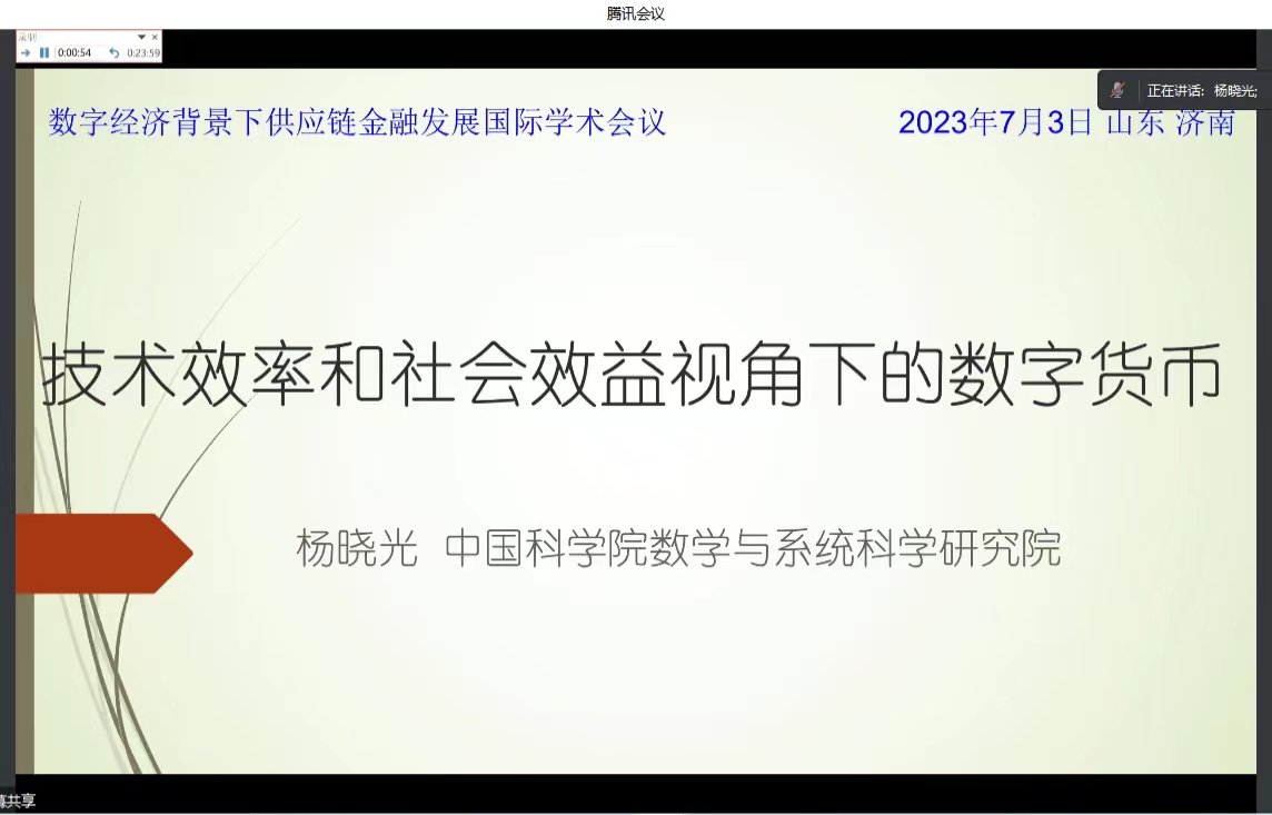 杨晓光教授做了题为“技术效率和社会效益视角下的数字货币”的报告。他从能源消耗、现实应用、风险与炒作持续期等多个方面对比特币进行了全面剖析,为我们揭示了数字货币领域的多重矛盾。他强调,拥有“天下”意识,是当今中国数字货币领域避不开的课题。对于该领域蕴含的潜在风险,他提出了以下两点建议:一、积极迎接,解决其中问题,开发低成本、高效率的产品;二、冷静思考,避免夸大好东西的作用,减轻好的东西带来的负作用。