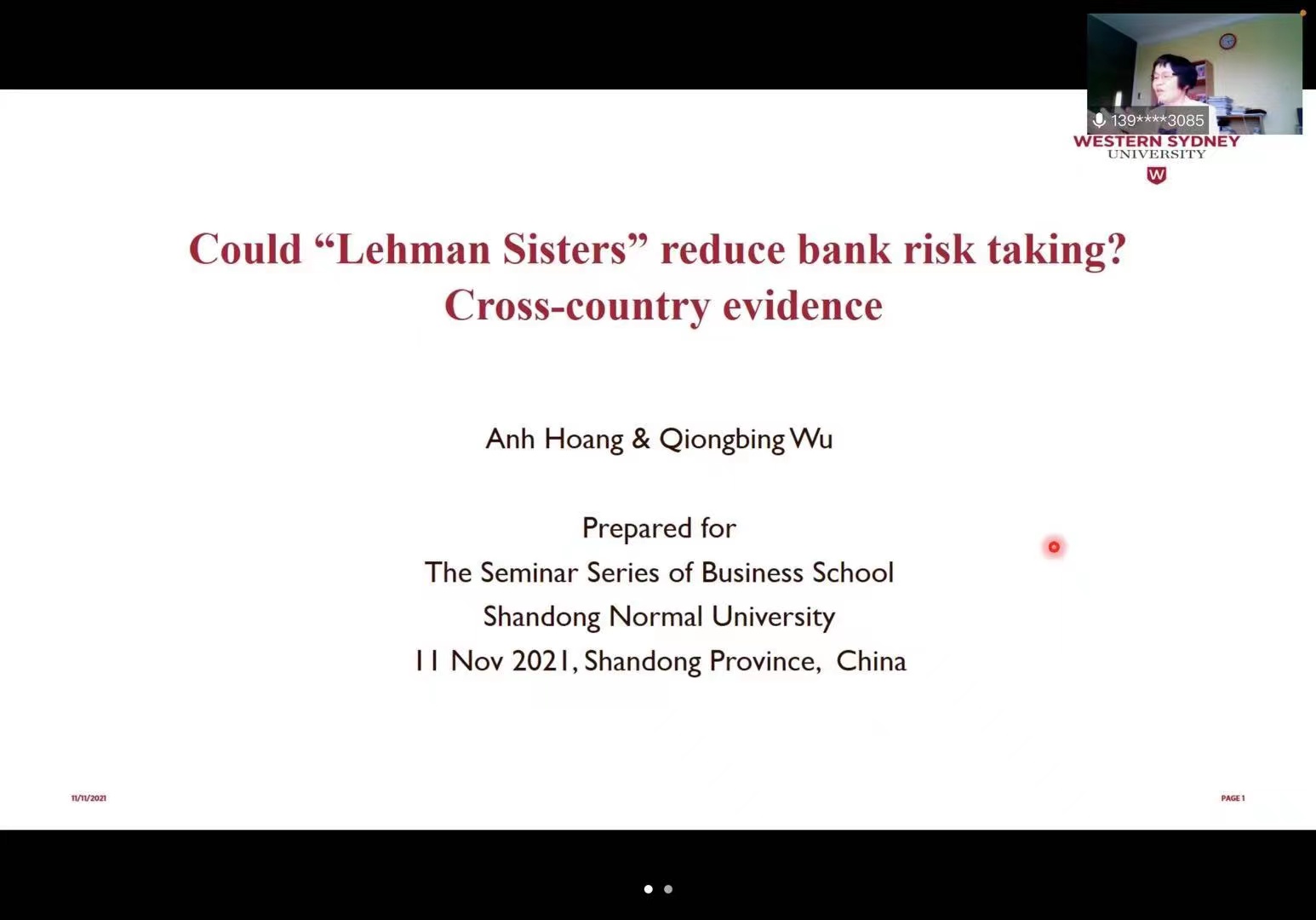 2021年11月11日下午14:00,365英国上市联合国际交流合作处、数字金融与企业发展国际合作研究中心主办的海外名师讲坛在腾讯会议线上如期举行。本次讲坛的主讲嘉宾Linda Wu教授,以“Lehman sisters能够降低银行的风险吗?基于跨国的证据分析内容”( “ Could “Lehman Sisters” reduce bank risk-taking? Cross-country evidence” )为主题做了精彩的学术汇报。