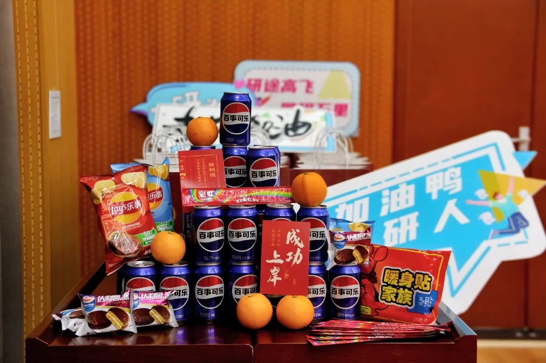 随后,老师们为考研学子发放了精心准备的“考研大礼包”,其中,橙子寓意心想事成,巧克力派象征巧克难题,暖贴传递暖心祝福……此外,辅导员们还为每位考研同学亲自书写祝福卡片,期望学子们都能在考研的战场上,镇定自若、游刃有余,展现出自己的最佳实力。