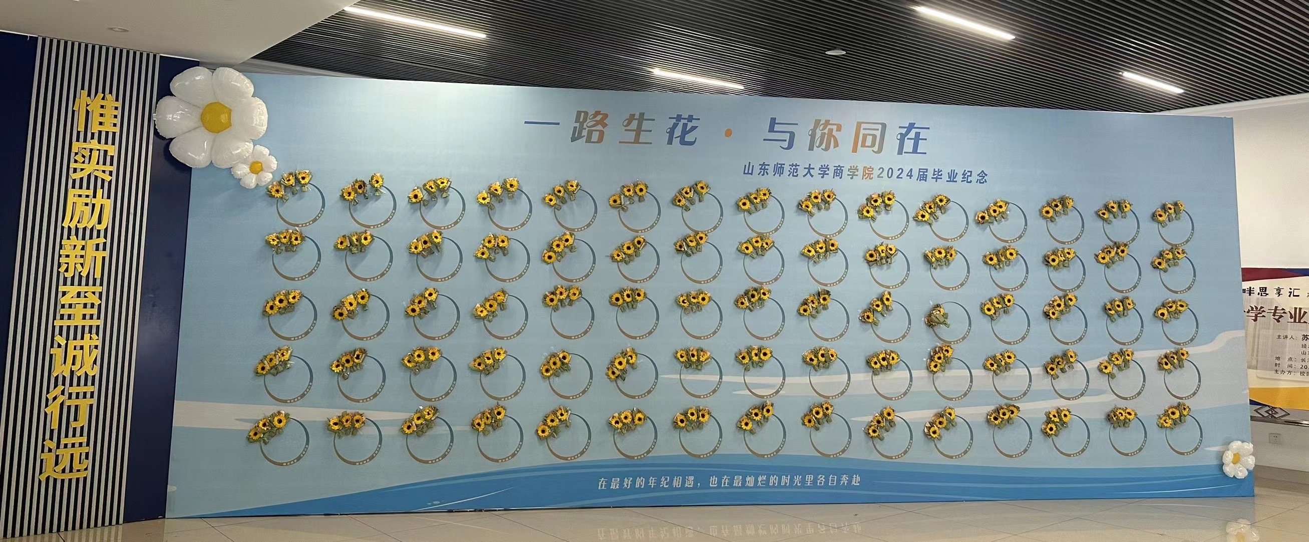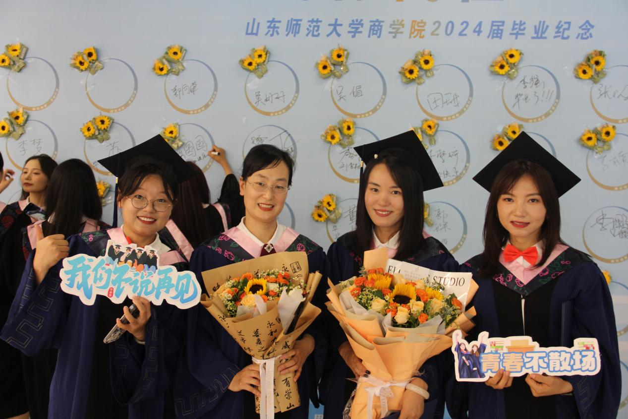 仪式伊始,毕业生们身着学士服,齐整地汇聚于文济楼门前,共同留下了他们学业生涯中难忘的一刻。随后,他们步入学院精心布置的花海墙,轻摘花朵,表达对母校的感激之情和对未来的美好祝愿。最后,毕业生们来到海报签字板前,在海报上写下自己的名字和祝福,每一个名字都代表着一段独特的学术旅程,每一个祝语都凝聚着对未来的热切期盼。这一刻,他们不仅是在告别过去,更是在向未来承诺会带着母校的教诲和期望,继续前行。