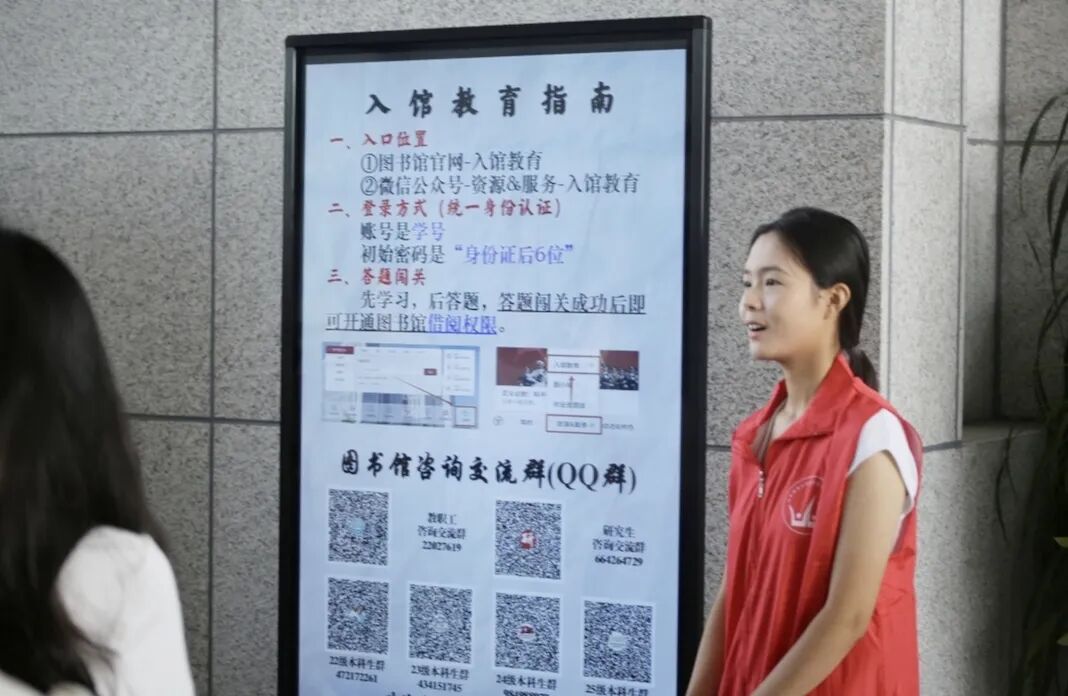 活动伊始,图书馆志愿者为新生系统讲解入馆流程,包括门禁使用、资源检索与图书借阅规则等,帮助同学们快速掌握使用技巧,为大学生活中的自主学习与科研探索打下基础。