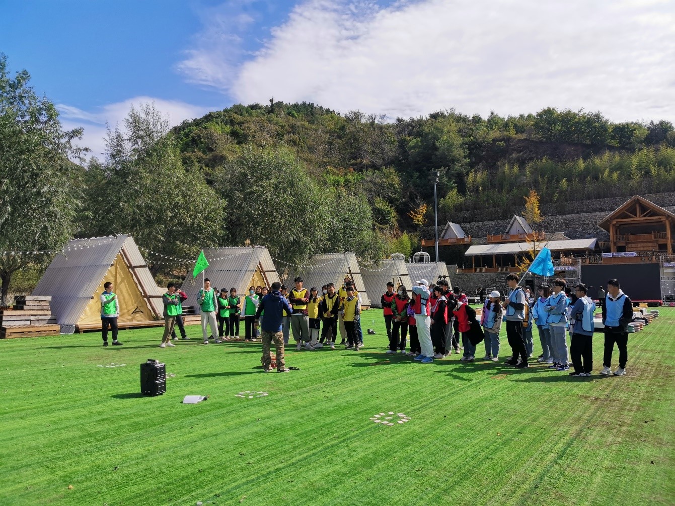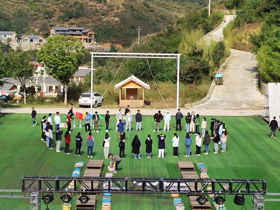 在教练引导下,同学们开启了破冰起航。大家随机分为四个小队,每个小队在简单交流后推选出小队队长。队员们集思广益、密切合作,各个队伍制作出本队队旗并确定队伍口号。在团队展示环节中,大家口号嘹亮,体现出了学子们“会当凌绝顶,一览众山小”的气魄,为一天的拓展团建项目做好氛围及学员投入奠定基础。
